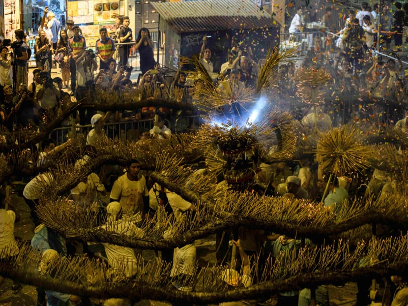 Throngs of festival-goers packed a historic neighbourhood of Hong Kong this week to watch a "fire dragon" lit with incense sticks dance through the streets in a century-old ritual. Photo: AFP