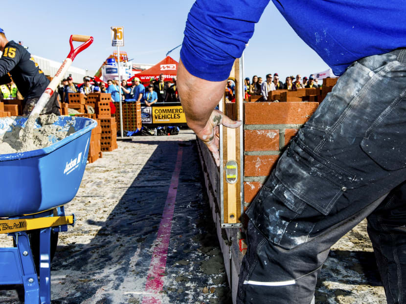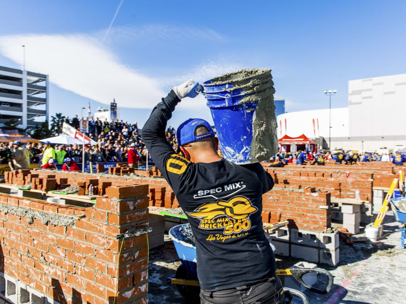Two-person teams compete in the Bricklayer 500 championship outside the Las Vegas Convention Center in Nevada. Here at the Bricklayer 500, humans are holding off the future with trowel and muscle. But that may not last. Bricklayers are becoming increasingly harder to find nationwide. Photo: The New York Times