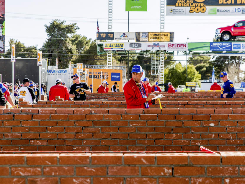 Workers prepare concrete to be used in the Bricklayer 500 championship outside the Las Vegas Convention Center in Nevada. Photo: The New York Times
