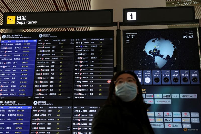 Travellers walk with their luggage past a display showing departure flight information at the Beijing Capital International Airport, during the Spring Festival travel rush ahead of the Chinese Lunar New Year, in Beijing, China on Feb 2, 2024.