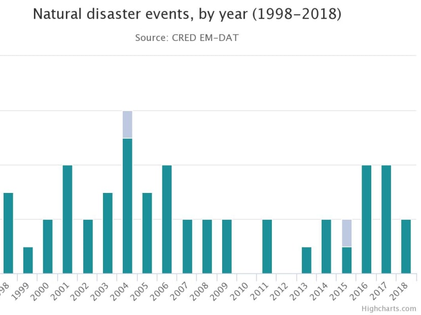 It is a slightly different story with deaths, with the 2004 earthquake and tsunami the deadliest disaster in the last two decades — killing 80 people.