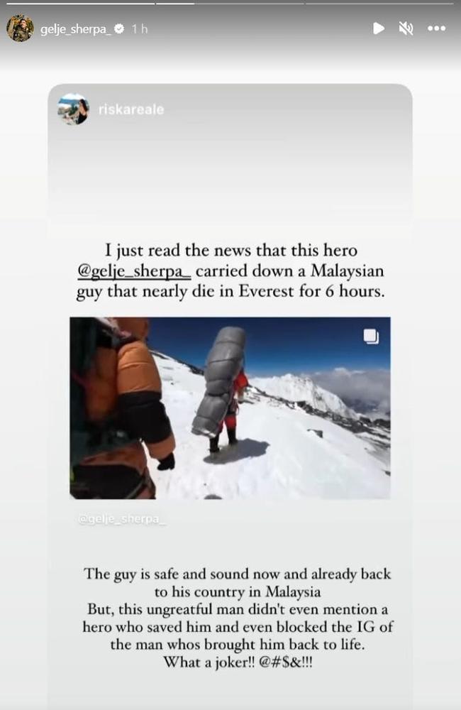 Separately, a Malaysian mountaineer was accused of being ungrateful after he thanked his sponsors in a number of social media posts instead of the Sherpa guide who rescued him.