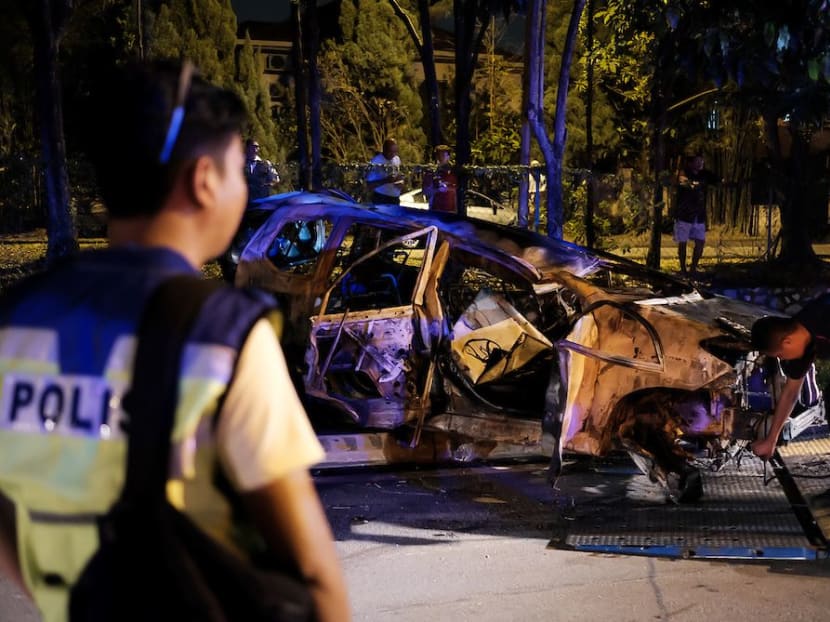 Policemen inspecting the wreckage of a torched car outside the Seafield Sri Maha Mariamman temple on Tuesday (Nov 27) night. Photo: The Malaysian Insight