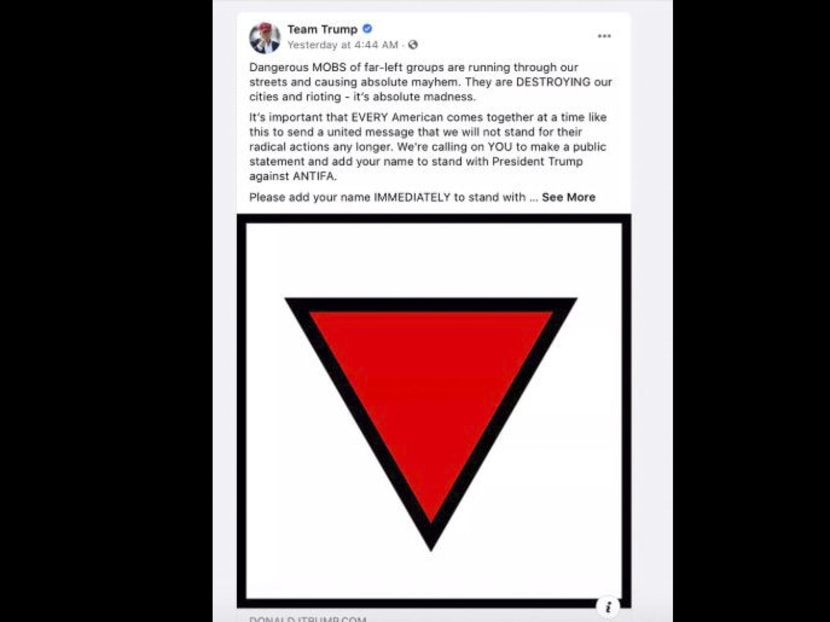 The upside-down red triangle was apparently a new addition to the ad, according to Media Matters, which found at least 88 ads on Facebook pages with that symbol.
