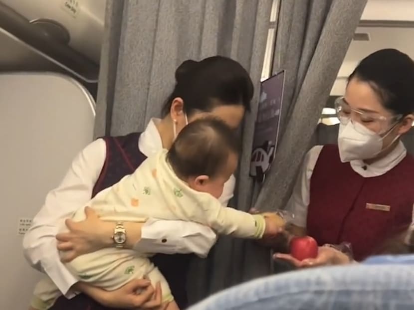 In a video shared on Douyin by an unknown passenger, the flight attendant can be seen carrying the calm-looking baby, occasionally rubbing his back and gently poking his cheeks.