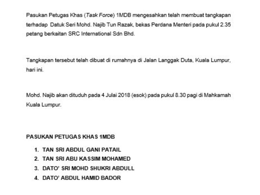 KUALA LUMPUR — Malaysia's former prime minister Najib Razak is expected to be charged on Wednesday (July 4), after he was arrested by anti-graft officers at his home around 2.45pm on Tuesday.