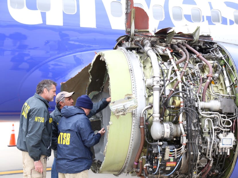 NTSB investigators examining the damage to the Southwest Airlines plane. Photo: Reuters