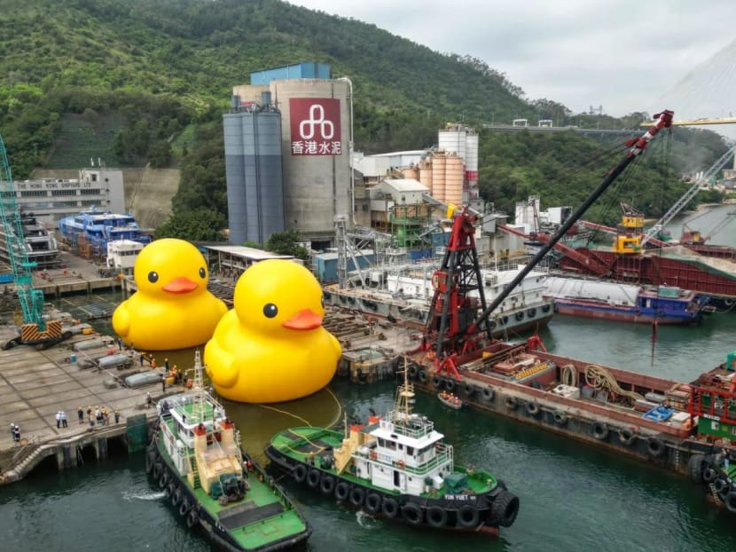 In the early hours of Thursday, dockyard workers were seen preparing to inflate the giant ducks. More than 20 staff members strapped the ducks to bases with the help of a crane before towing the installations out to nearby waters for a test run.