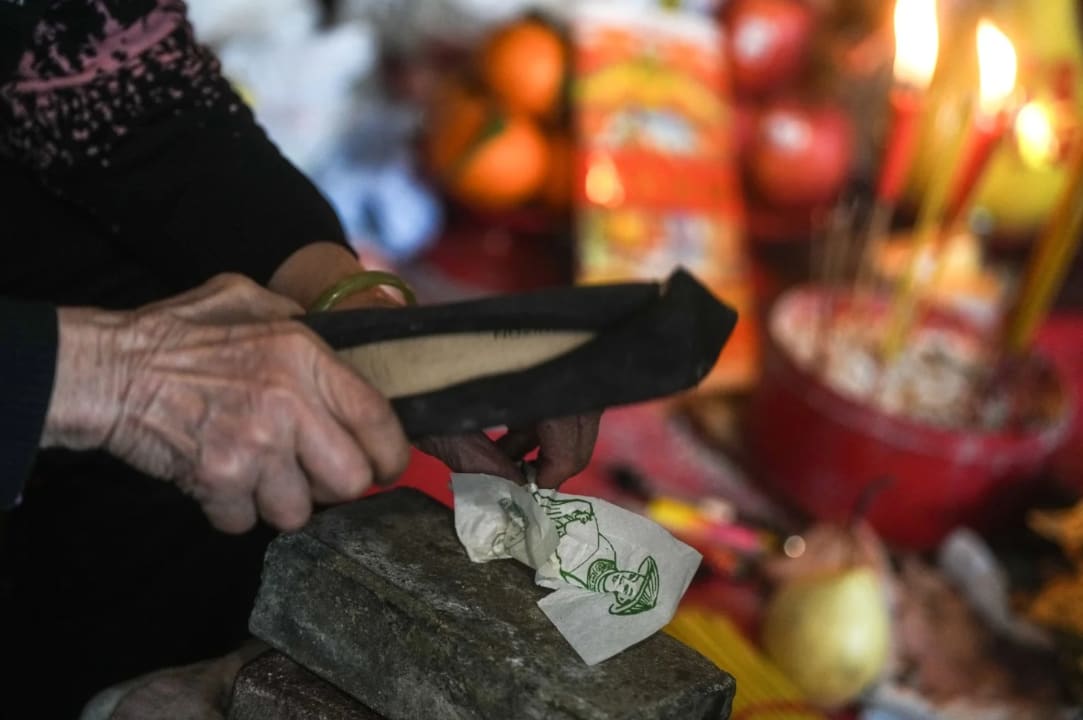 Long queues formed throughout the day at about 18 stalls, with the rhythmic beating of paper effigies and the jingling of bells resonating in the smoke-filled area underneath the flyover, as the mostly elderly women used shoes to symbolically attack their customers’ “enemies” before burning joss paper.