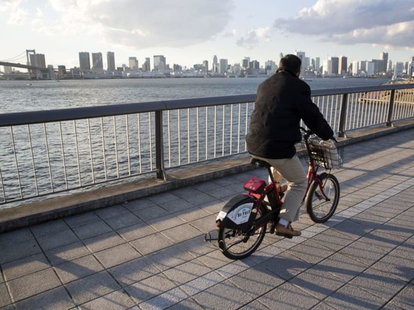A man rides a rental bicycle in Tokyo. Photo:Bloomberg