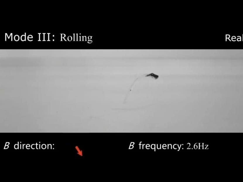 Changing the magnetic fields allows the researchers to twist the robot’s body in many different ways and achieve a wide range of movements such as crawling, swinging and rolling, according to their paper.