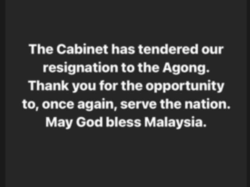 Rembau MP Khairy Jamaluddin, in a Instagram post, confirmed that the Cabinet has tendered its resignation to Malaysia's King. Mr Muhyiddin is expected to address the nation soon.