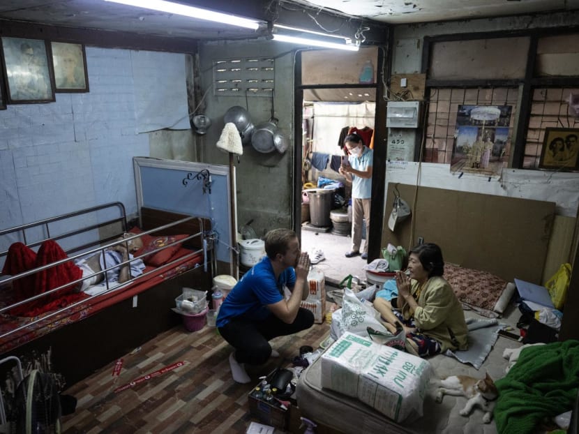 Her 75-year-old husband Suchart Kaewkhio lies on a bed, in an adult diaper, staring up at the peeling paint and water-damaged ceiling but Ms Chusri said they had no money for repairs.
