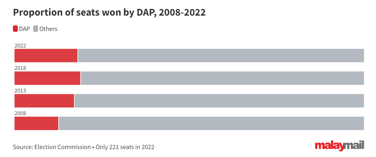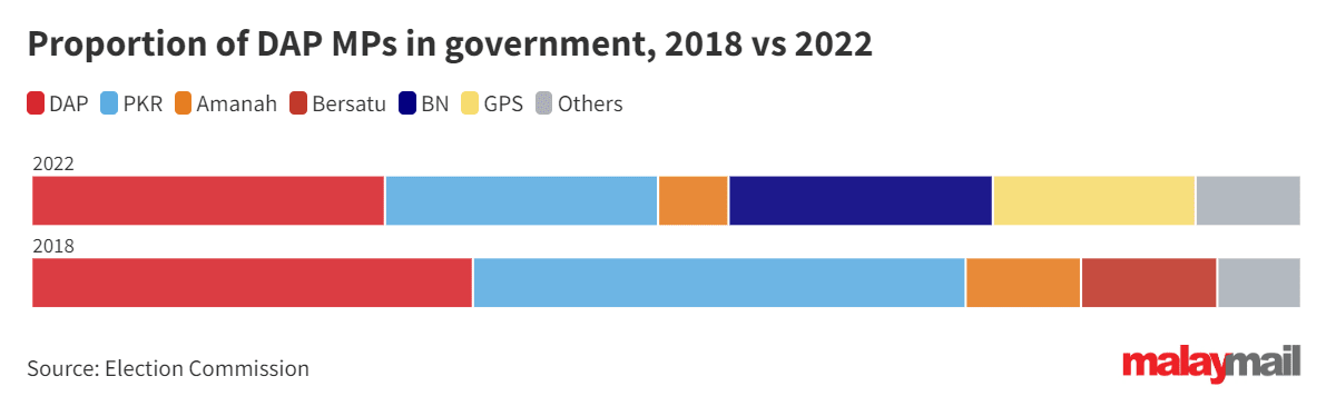 As reported by Malay Mail last year, DAP MPs only make up 27.8 per cent of the total government seats. Its proportion in the government is much lower compared to in 2018, when Dr Mahathir was prime minister.