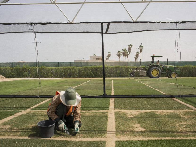 At Aspire Sports Turf, workers tend the the grass being grown for the World Cup 2022 stadiums. Photo: The New York Times