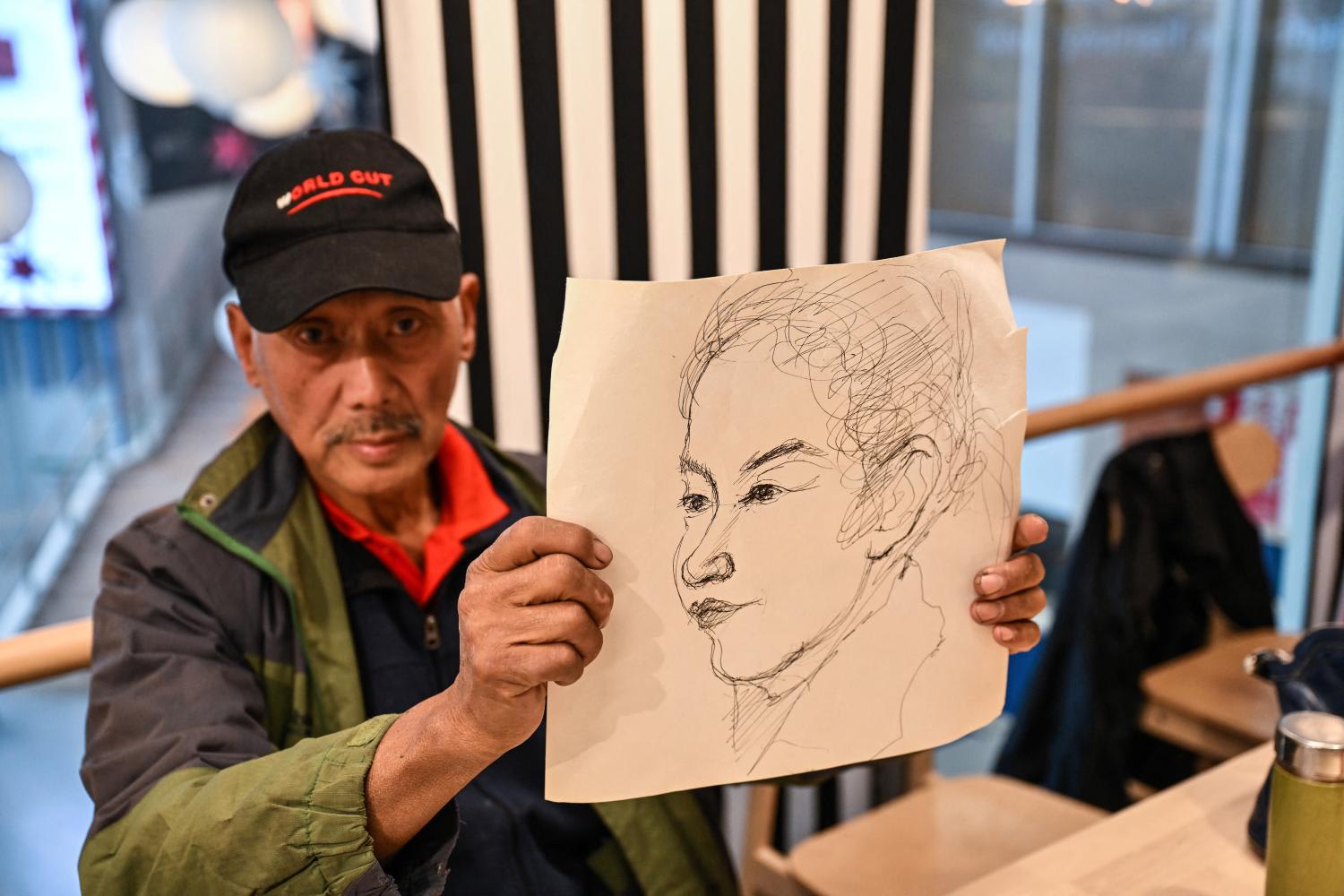 This photo taken on Dec 5, 2023 shows artist Li Shiqi (left) drawing a portrait of another person at the Ikea restaurant, where elderly people gather every Tuesday, in the Xuhui district in Shanghai.