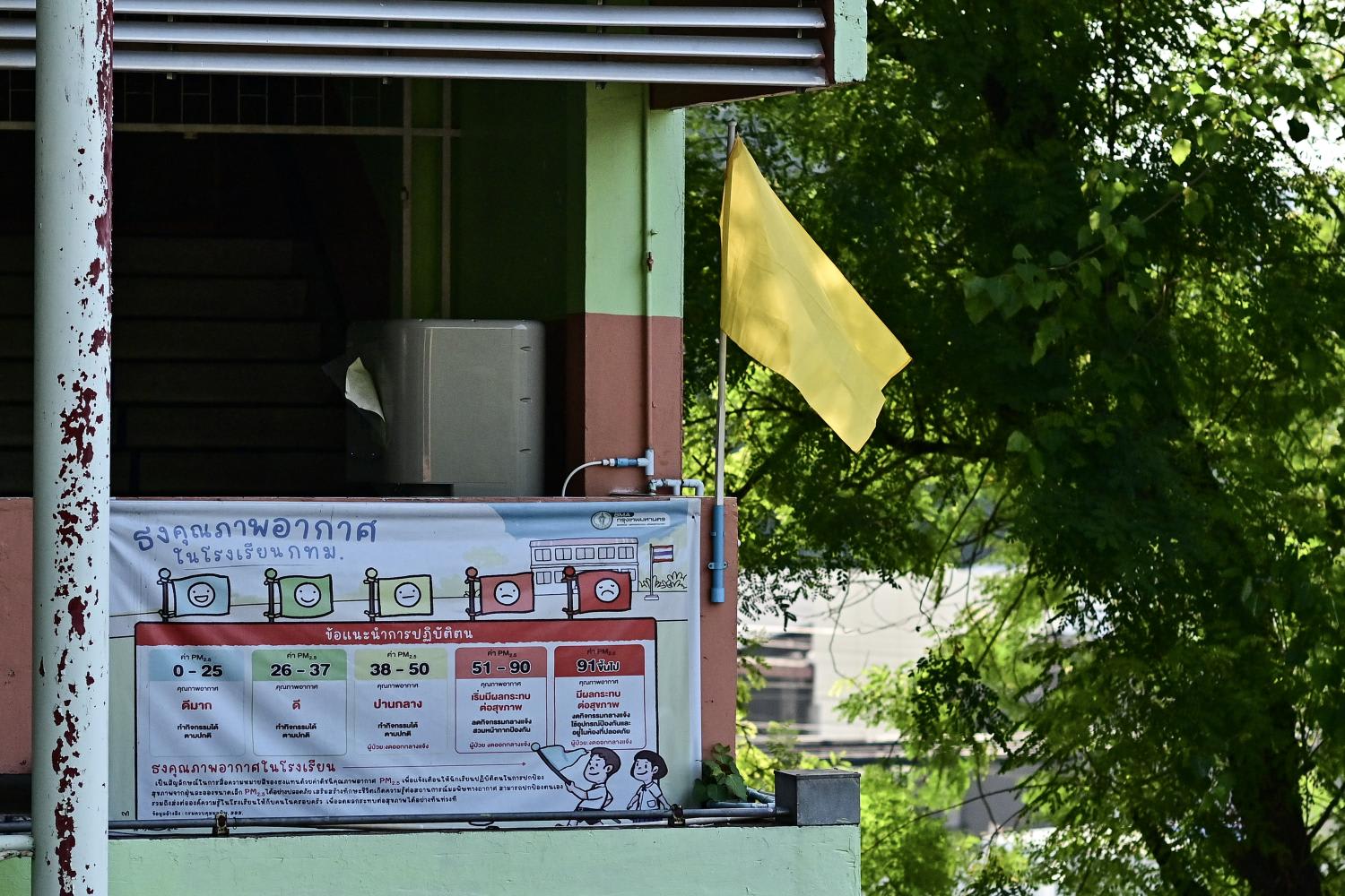 Pupils at Suan Lumphini School assemble each morning under a coloured flag indicating the day's air quality — red for worst, yellow for second worst, blue for best.