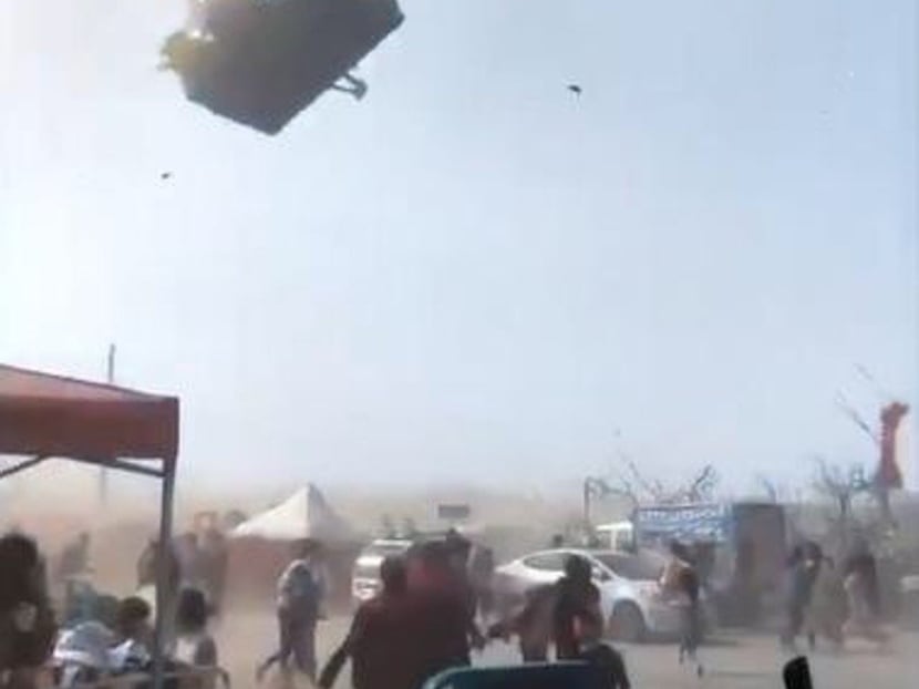 HENAN (China) — Two children were killed and 20 people were injured when they fell from an inflatable bouncy castle as it was swept into the air by a tornado-like “dust devil” in central China on Sunday (March 31).