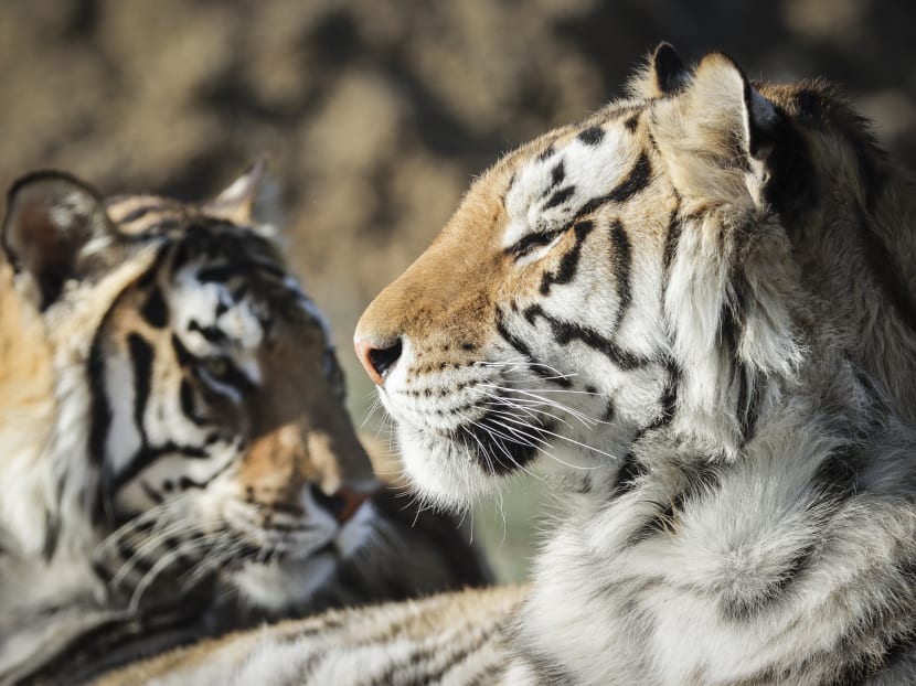 A pair of the 39 tigers rescued in 2017 from Joe Exotic's GW Exotic Animal Park relax at the Wild Animal Sanctuary in Keenesburg, Colorado, US on April 5, 2020.