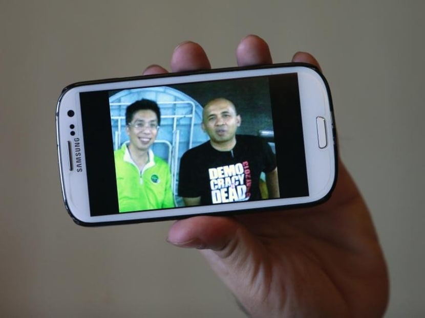 Activist Peter Chong holds up his smartphone to show a photo of himself (left) with missing Malaysia Airlines Flight MH370 captain Zaharie Ahmad Shah at a hotel in Sepang, on March 18, 2014. Photo: Reuters