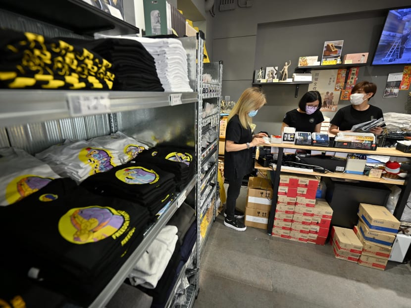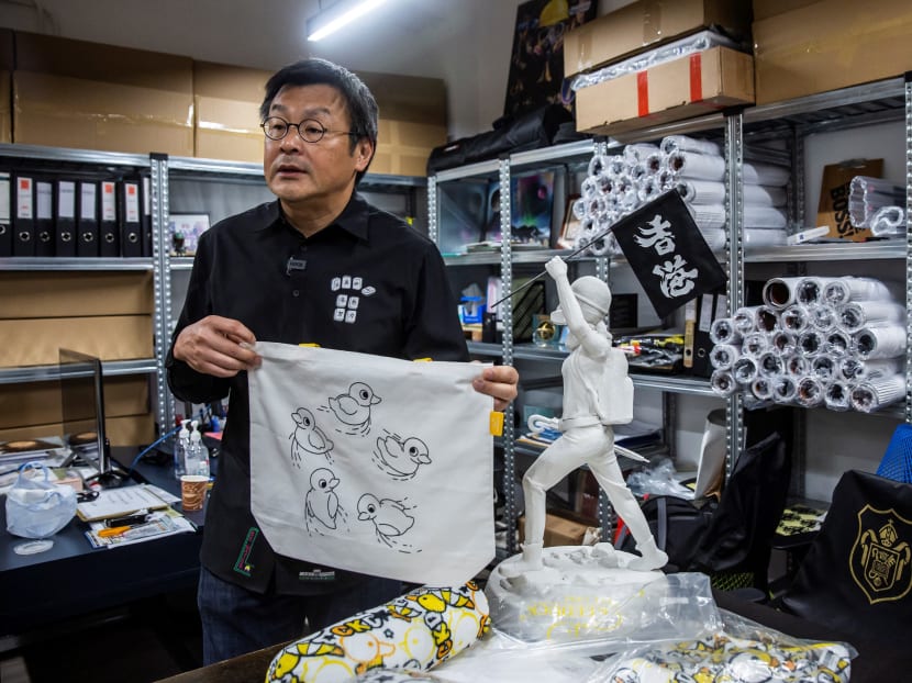 They included cushions with yellow birds holding umbrellas alongside "I love HK" speech bubbles, and canvas bags featuring five ducklings swimming on one side and a flag-bearing chicken on the other.